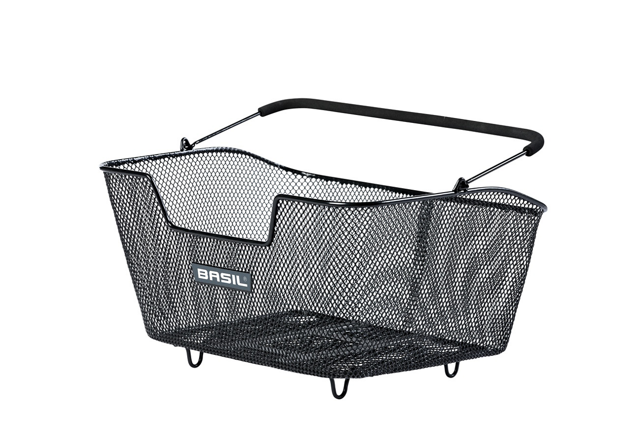 BASIL BASE M MULTI SYSTEM, bagerste cykelkurv, medium, stål, mesh, aftagelig, Soft Grip håndtag, beskyttelsesfødder, kompatibel med Racktime, i-Rack/Carry-m. plader (IKKE INKLUDERET), med Soft Grip håndtag, sort