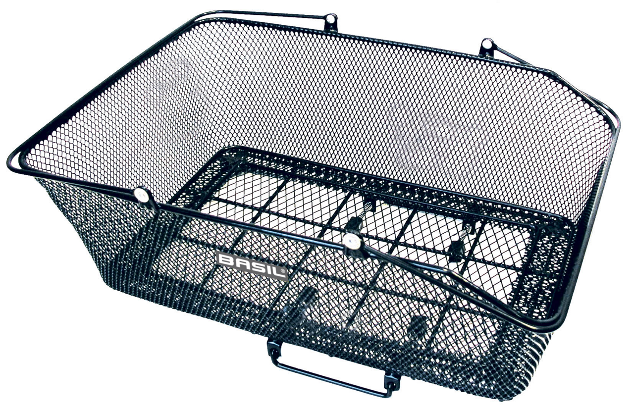 CALIFORNIA, bagerste skoletaskekurv, stål, mesh, aftagelig, med skridsikker BASCO-spændeanordning til bagagebærere med max. 16mm Ø rør, kurv placeres på langs, med to håndtag, skrå, sort