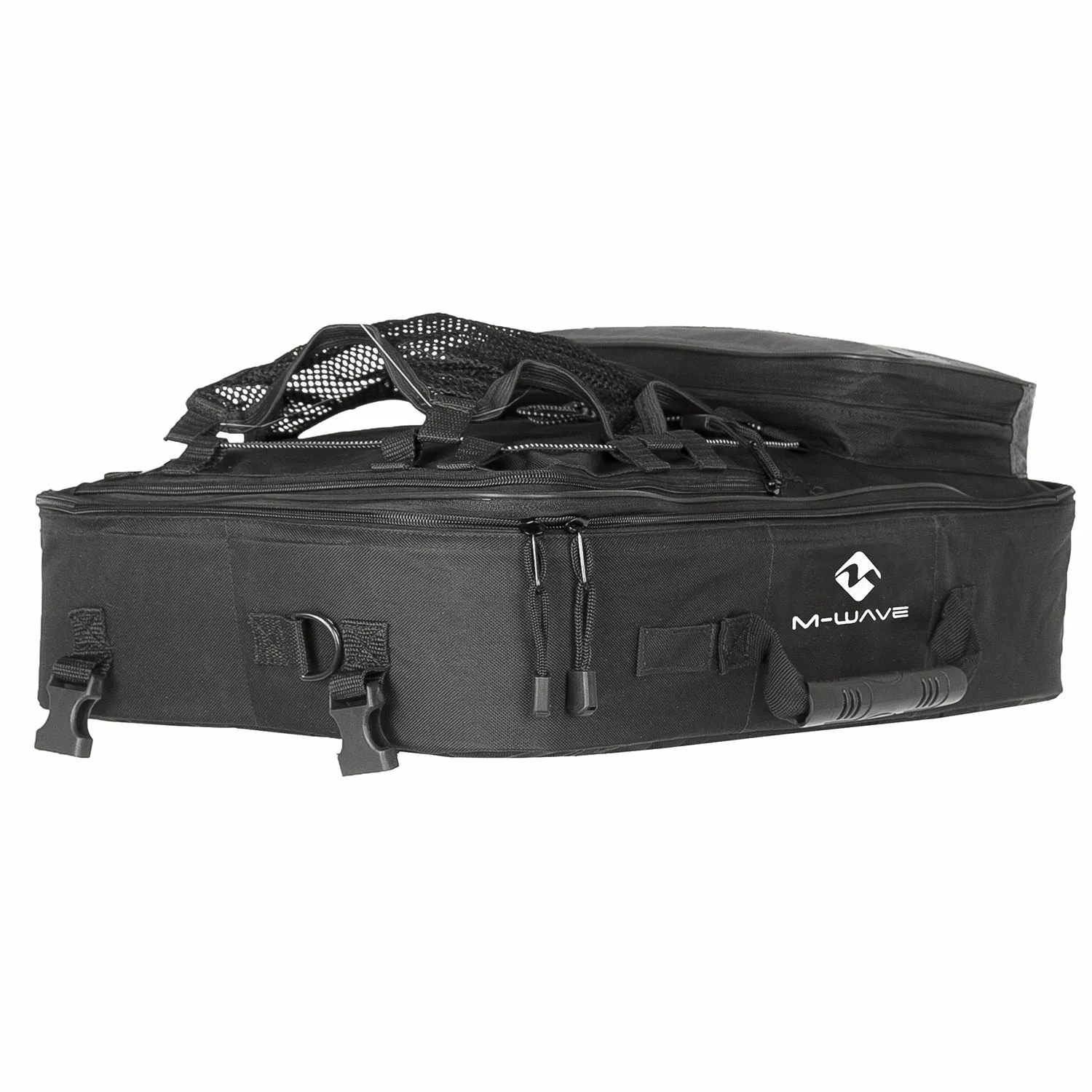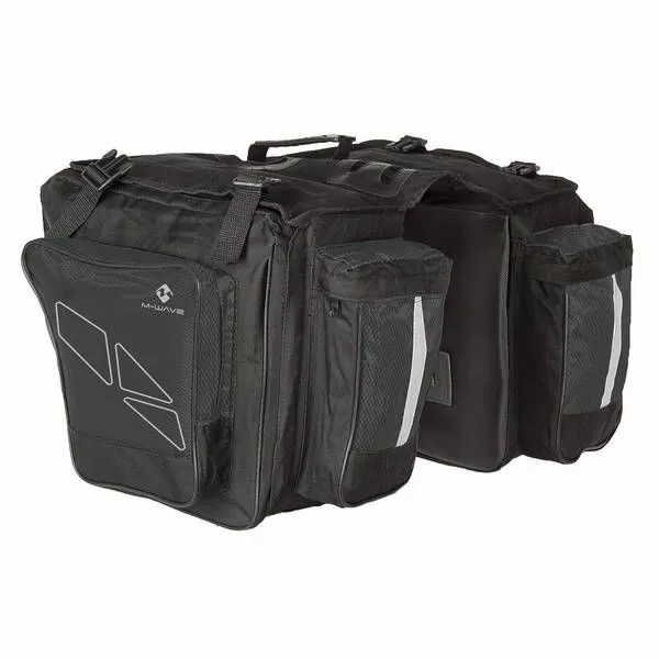 Bæretasken “Amsterdam Triple” fra M-Wave består af to sidelommer og en toplomme. Sidelommer har et volumen på 38 liter hver og er tilgængelige via en lynlås udefra. Dette giver adgang til din bagage uden behov for at tage tipposen af. Bagage kan organiseres praktisk talt i fire udvendige lommer. Haletasken er den rigtige ting til vandflasker. På haletasken er reflekterende striber placeret for sikkerhed i mørket.