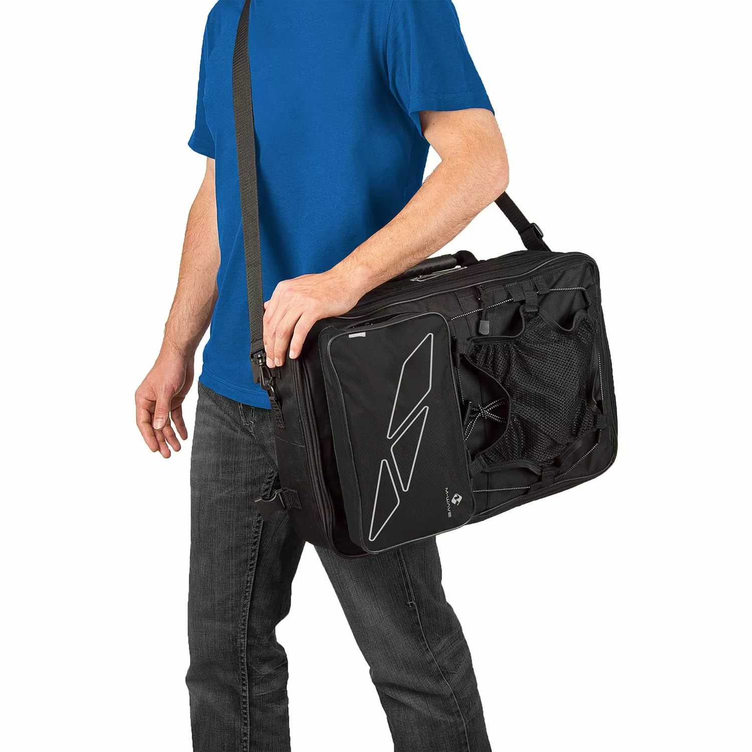 Toptasken kan fjernes fra sidetaskerne ved hjælp af fire spænder, og kan derefter bruges som en skuldertaske eller endda som en rygsæk