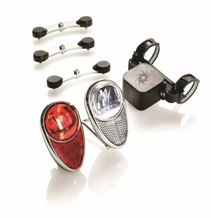 – For- og baglygterne drives af en enkelt generator, der monteres på bagstræberen. Cykellygterne drives af induktion, gennem generatoren der virker ved hjælp af en indbygget spole og magneter monteret på egerne – helt uden brug af batterier. Lygterne er permanent monteret, så du altid har dem med dig. Lyset er altid tændt, når du cykler, hvilket gør dig ekstra sikker i trafikken – dag og nat.